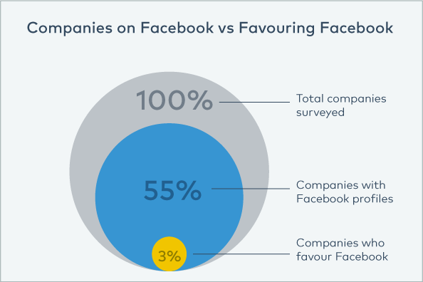 It is notable that half of the companies were on Facebook (56%), but only 3% favoured using it, even though half of those on it posted on a regular basis. Approximately a third of the companies correctly have a balance across all digital channels.